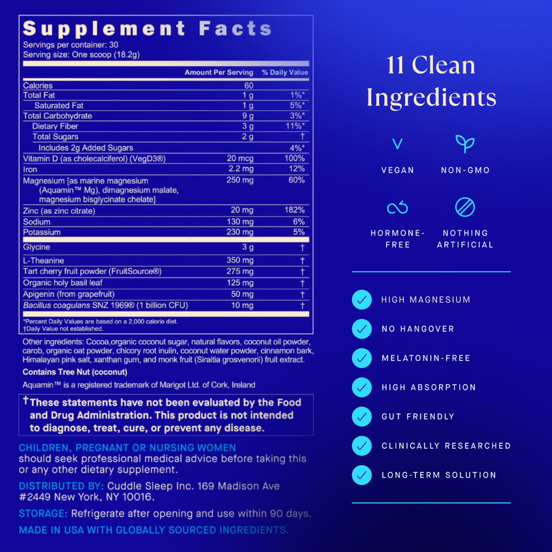 Cuddle Sleep+ Formula is formulated and contains clinically proven ingredients. The main ingredients that support sleep are: Aquamin® Magnesium, Glycine, L-Theanine, Tart Cherry, Organic Holy Basil, Apigenin, Organic Vegan Vitamin D3 and Zinc.